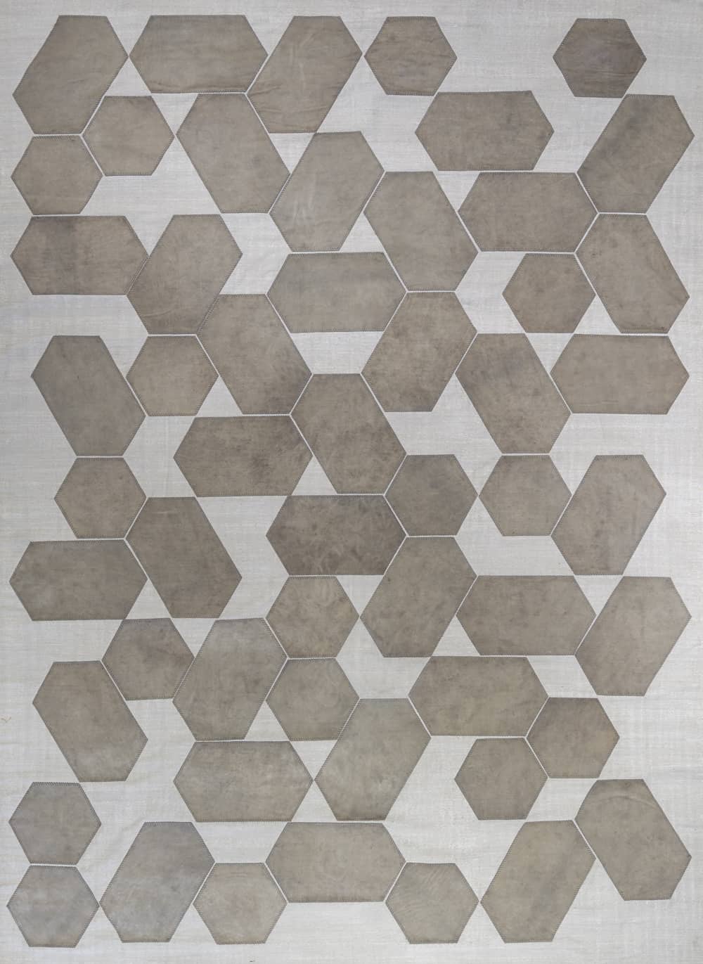 Its leather patches whip-stitched atop a field of silk, Holborn’s geometry is augmented by the play between negative and positive spaces – here, the opaque density of elongated leather hexagons; there, the textural counterpoint of flatwoven silk. All, accentuated by heavily corded hand-stitching.