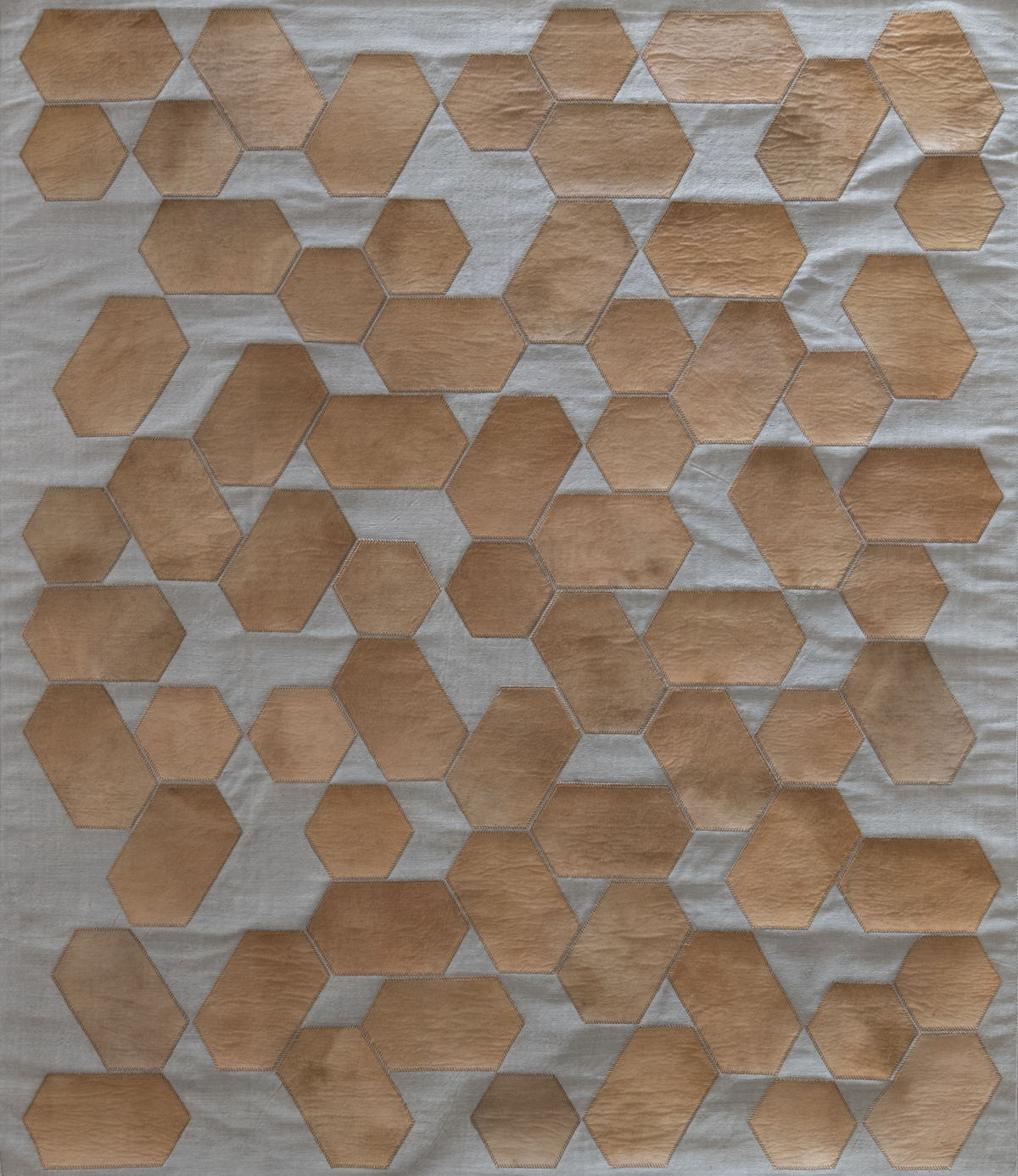 Its leather patches whip-stitched atop a field of silk, Holborn’s geometry is augmented by the play between negative and positive spaces – here, the opaque density of elongated leather hexagons; there, the textural counterpoint of flatwoven silk. All, accentuated by heavily corded hand-stitching.